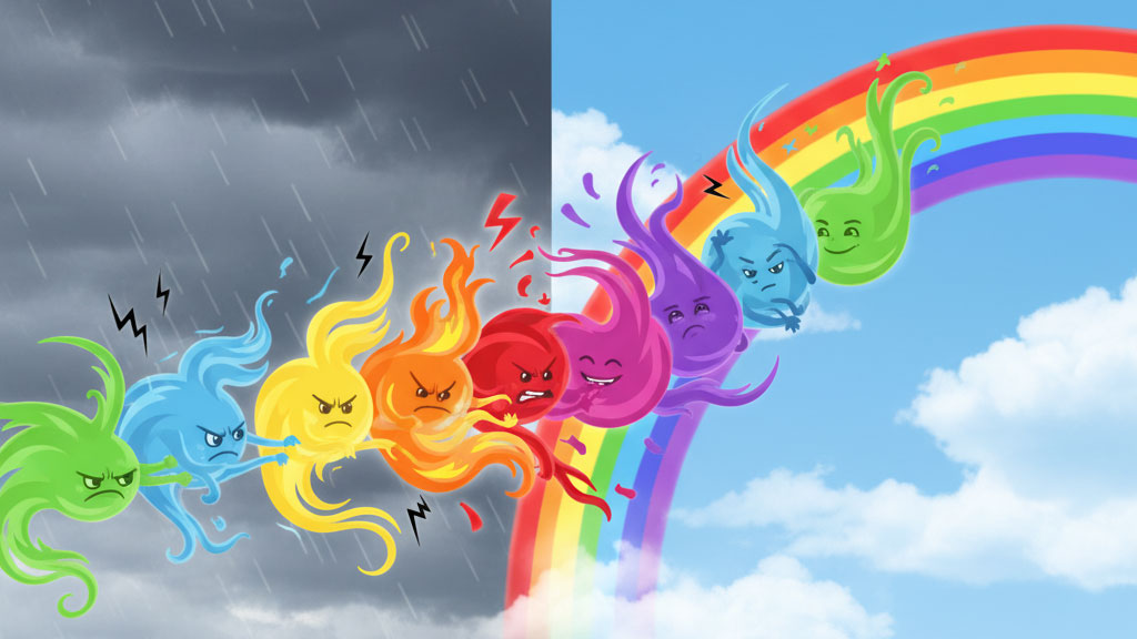 E così i colori continuarono a litigare, ciascuno convinto della propria superiorità. Le voci si fecero sempre più forti, finché un lampo squarciò il cielo e un tuono fragoroso, seguito da una pioggia violenta, li fece tremare di paura. Atterriti, si strinsero l'uno all'altro per cercare conforto.
